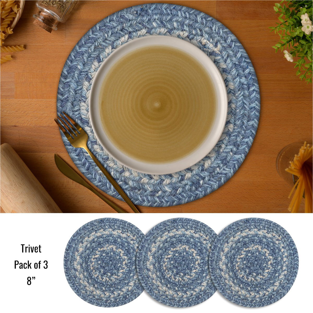 Denim jute braided accessories feature a calming blend of blue and white. Handcrafted from premium jute, it offers a charming look with a tightly braided, non-shedding construction that lays flat on your furniture and protects it.