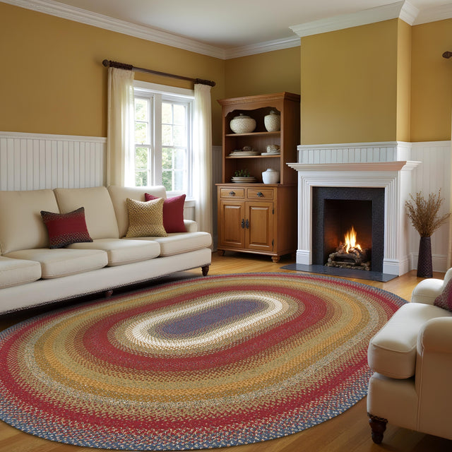 The Log Cabin Step Multi Color Cotton Braided Oval Rug features bold tones of blue, burgundy, mustard, brown, and cream. Handcrafted from durable cotton, it’s soft, reversible, and easy to maintain ideal for high-traffic areas.