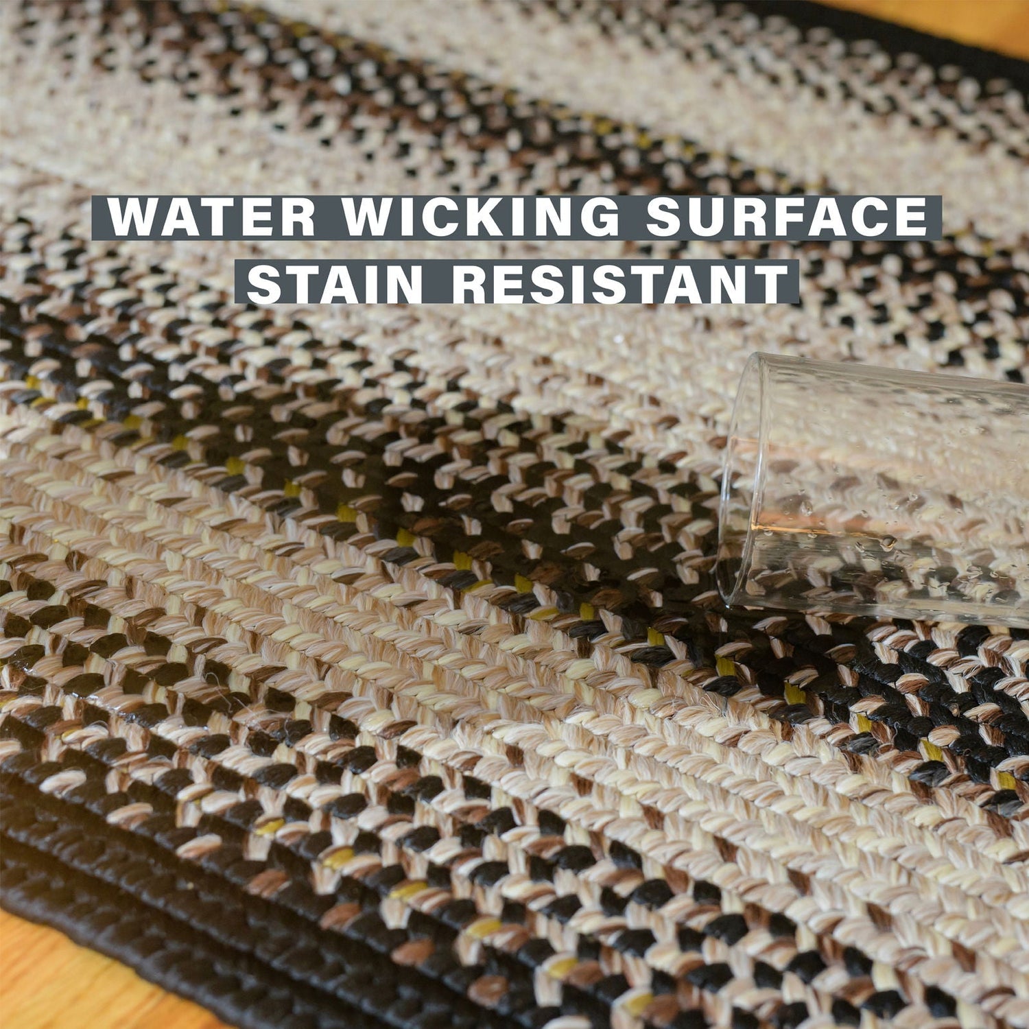 The Black Mist braided oval rug blends bold black with shades of brown and cream for timeless style. Made from premium materials, it's stain resistant, washable, waterproof, and pet friendly for indoor and outdoor use.