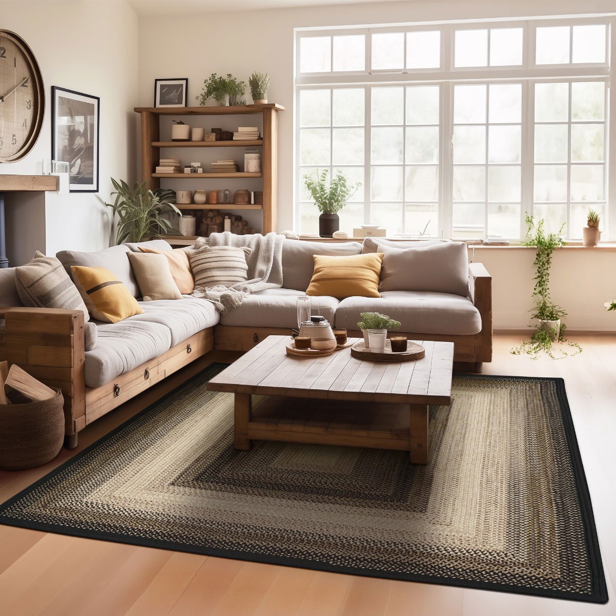 The Black Outdoor braided rectangular rug offers a bold blend of black, brown, and cream colors. Made from premium polypropylene, it's stain resistant, washable, waterproof, and pet friendly for indoor and outdoor use.