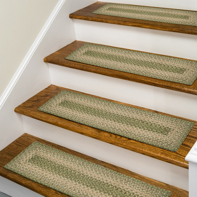 Grassland jute braided stair treads showcase a soothing blend of green, tan, cream, and soft brown tones that bring a touch of nature indoors. Handcrafted from premium jute, these treads offer a fresh, earthy look while providing lasting durability. Each tread is tightly braided and lays flat on your stairs for a smooth, secure finish without shedding.