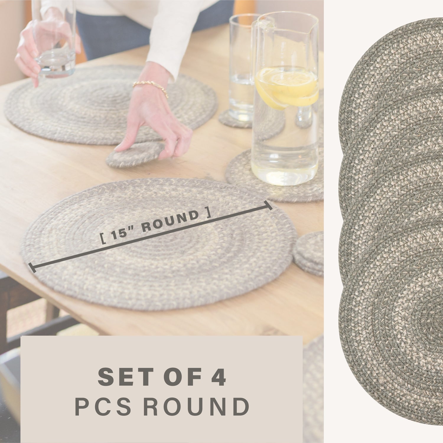Grey Cloud jute braided accessories feature a warm blend of grey, ivory, taupe and cream. Handcrafted from premium jute, it offers a timeless look with a tightly braided, non-shedding construction that lays flat on your furniture and protects it.