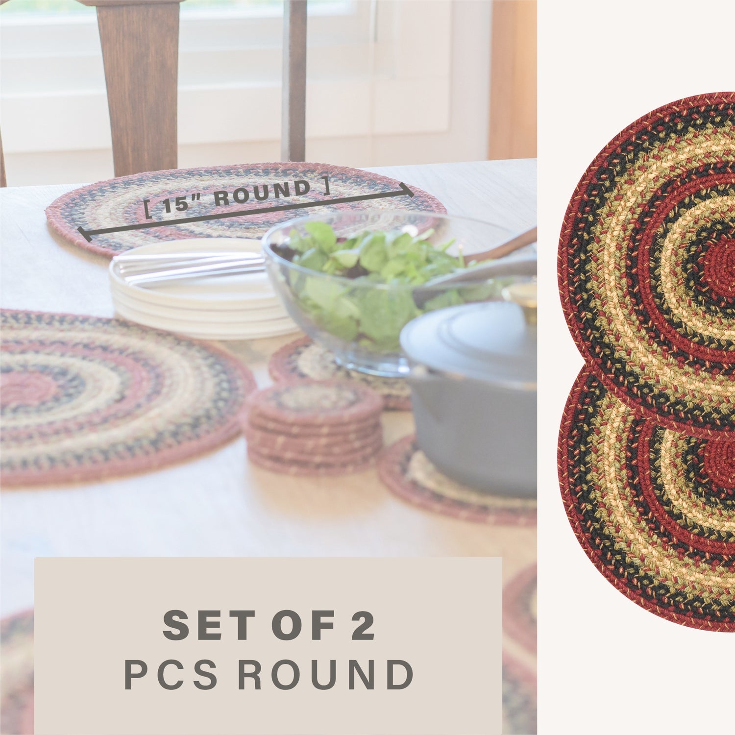 Highland jute braided accessories feature a warm blend of navy, burgundy, green & off-white. Handcrafted from premium jute, it offers a timeless look with a tightly braided, non-shedding construction that lays flat on your furniture and protects it.