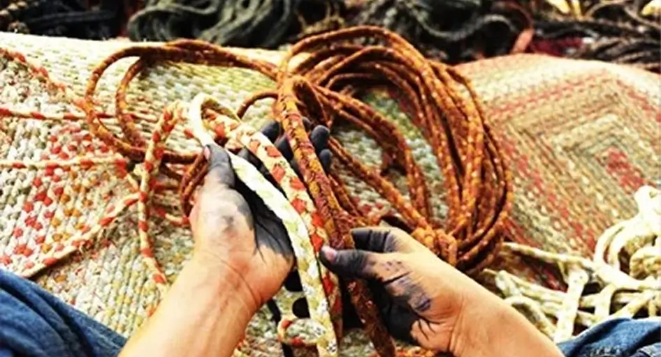 Every thread tells a story. Our founder, hands stained with passion, perfectsthe colors for each braided rug.